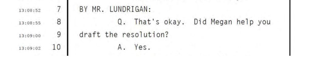 When questioned about the origins of the document, Sara Jonas under oath stated she merely ‘typed’ the Resolution – a clear conflict with her public statement at a public board meeting, June 22, 2022 (audio available on YouTube, at 1:32:00) where she claimed, “I am the one who authored it.”