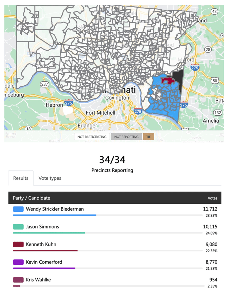 Strickler-Biederman won nearly every precinct, with Kuhn winning Newtown B. Kuhn and Comerford tied for the win in Anderson Y, a precinct that runs along 8 Mile Rd and Broadwell, as can be seen on the map in the image provided above.