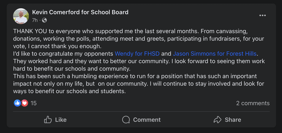 Kevin Comerford conceded the race with dignity, and offered congratulations to his opponents on Facebook late on November 7th.
