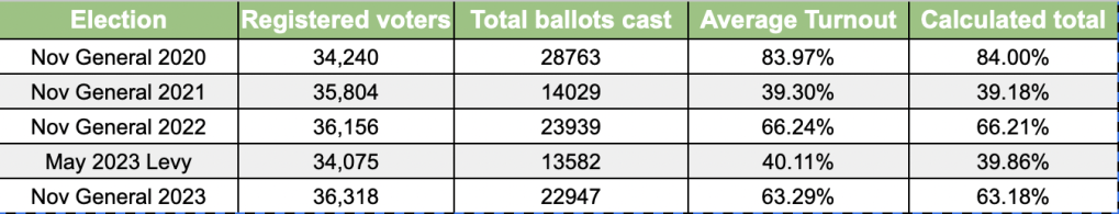 Turnout was very high across the district, Newtown precincts A & B exceeded 50%, Anderson districts exceeded 60% in nearly every precinct, and for the school district as a whole we saw over 63% turnout. This year’s turnout is compared to prior elections below.