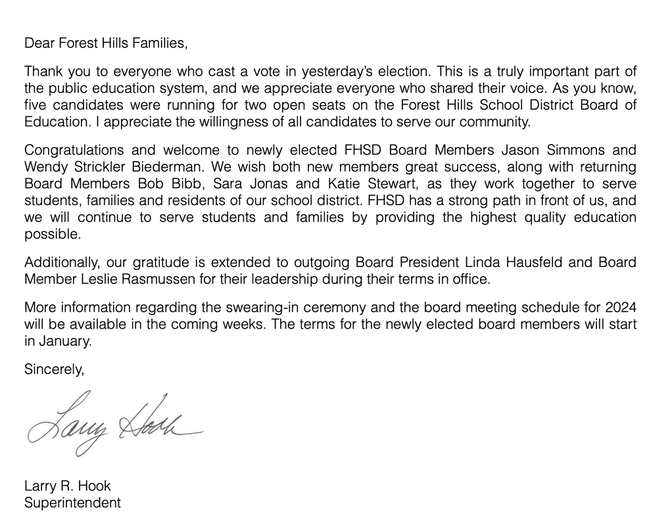 The Forest Hills School District Superintendent sent out this note this morning, announcing the news about the new board members.