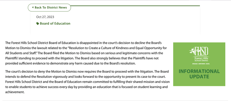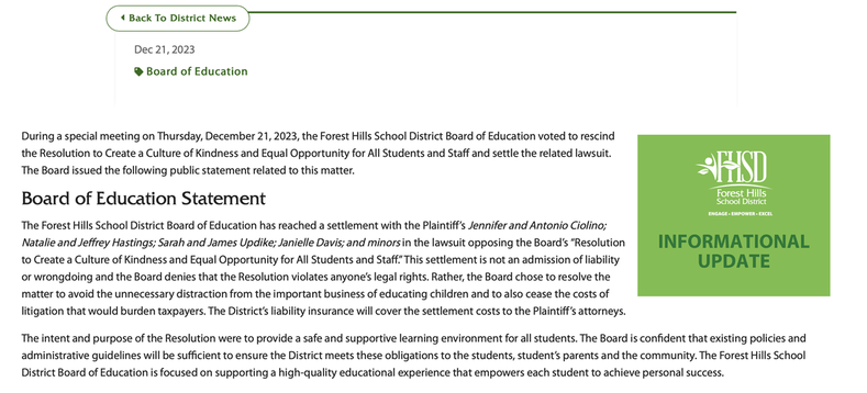The district has issued a statement, now available on the Forest Hills School District Website, claiming that the “settlement is not an admission of liability or wrongdoing” and that the board “denies that the Resolution violates anyone’s legal rights.”