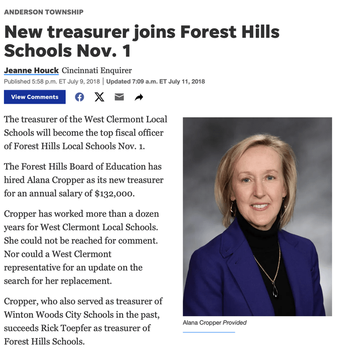 District leadership hired Cropper six years ago after a tumultuous period in the treasurer’s office unrelated to finances. In order to restore trust in the community, the district sought out one of the best-performing licensed treasurers in the Ohio school financing. FHSD has won a State Audit award every year since then. (See Enquirer article covering details, here.)