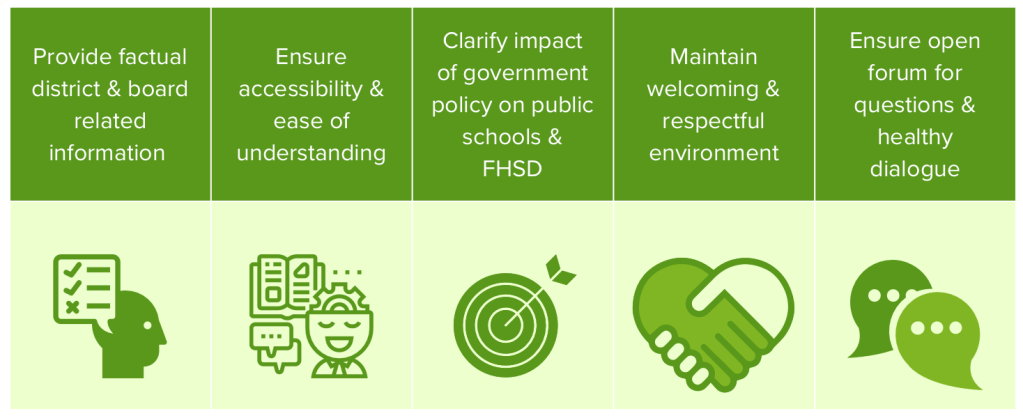 Advocate FHSD is not a one-size fits all space, we do not desire to be. We always encourage others to create & engage in spaces that suit them and help support their strategies to reach residents and voters. We recognize that reaching voters across the political spectrum takes on many forms – our approach to inform and build a strong coalition of supporting public schools is outlined below.